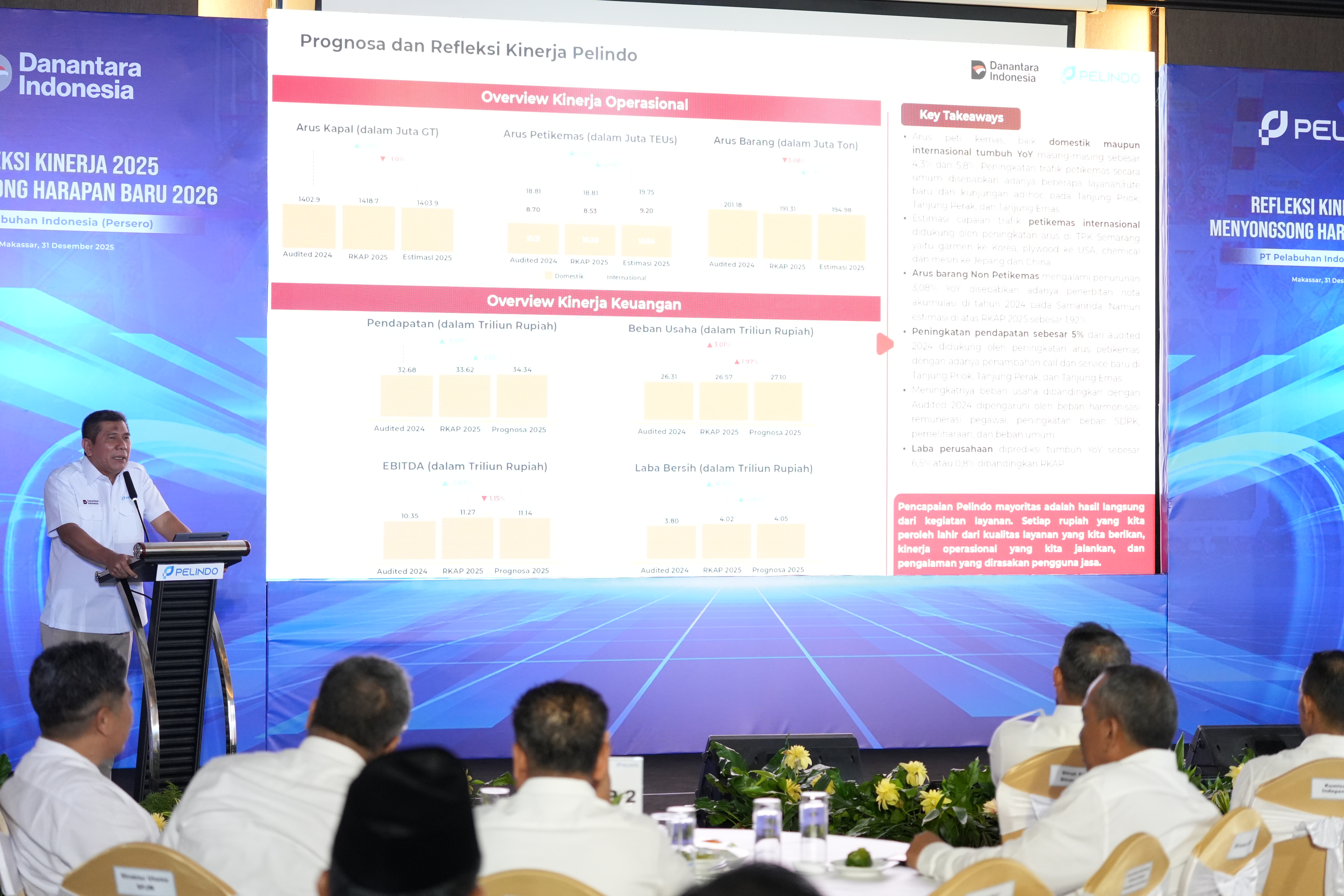 Kegiatan refleksi akhir tahun ini dihadiri oleh jajaran Komisaris, Direksi, dan Manajemen Pelindo Group, seluruh pengelola Terminal Peti Kemas Pelindo Group yang diikuti secara hybrid, serta para stakeholder, asosiasi, dan pengguna jasa pelabuhan. Di mana kehadiran lintas elemen ini mencerminkan semangat kolaborasi Pelindo dalam membangun ekosistem kepelabuhanan nasional yang terintegrasi, andal, dan berdaya saing global.